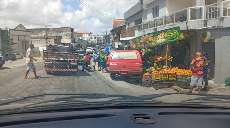 Imagens de câmeras de segurança registraram o momento em que um carro de transporte alternativo sai da via e invade uma banca de frutas no